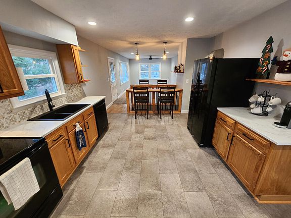 Completely renovated 3 bed 1 bath ranch style home with deeded lake access to Kenyon Lake within walking distance. Open concept floor plan with large living room and huge kitchen. New tile flooring in kitchen and beautiful hardwood oak flooring throughout the rest of the home. Gorgeous oak cabinets in the kitchen, with an abundance of counter space. Large full basement for additional storage and rec room. Newer siding, windows, roof and doors. Home sits on .75 acres and includes an attached 1 car garage, a large utility shed, plus a newly added detached 2 car pole barn. Move in ready, all appliances included.