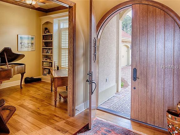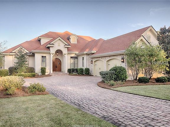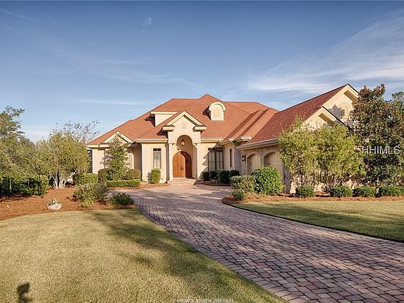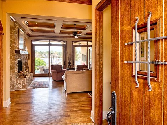 Magnificent lakefront home welcomes you to brilliant details, elegant upgrades and timeless design. Built to accentuate the breathtaking lake views, private pool, lush landscaping and outdoor lifestyle, this home captures the essence of life in the Lowcountry. Mahogany double doors welcome you to quality and comfort: a Great room with masonry FP and cabinetry, parlor, wet bar, DR, butler's pantry, hobby room, guest suite. A designer kitchen, hearth room with FP leads to lakeside outdoor kitchen, covered porches. Main level master suite offers separate outdoor access. Upstairs guest room, gym, office with private balcony to enjoy the lake.