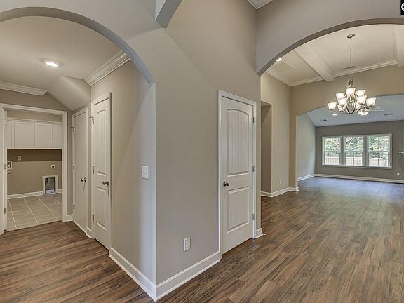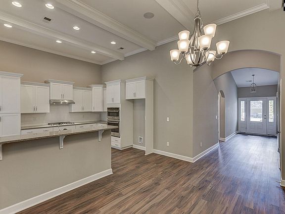 This Hartford has three bedrooms and three-and-one-half baths with two master suites on the main level and the third bedroom and full bath upstairs. A vaulted entry foyer leads to the gourmet kitchen and spacious dining area with a 12' flat ceiling and crown molding trimmed beams. The family room with fireplace opens to a large covered porch. Both master bedrooms have private alcoves with linen closets and the primary master suite includes a huge 5' x 5' tile shower. Luxury vinyl plank flooring is included in living areas with ceramic tile flooring in all full bathrooms and the laundry room. There are many decorator touches throughout including white cabinets, and quartz countertops in the kitchen. Stone accents at the garage and a covered back porch with a patio ideal for grilling.