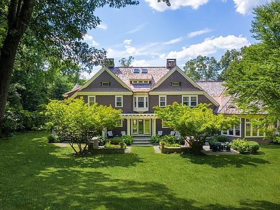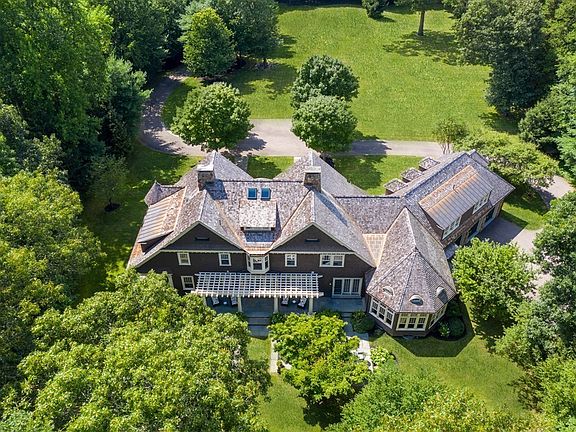 Spectacular custom shingle & stone estate abutting conservation land showcases the best of American design and craftsmanship. Nestled on Weston's highest point w/ 2.68 acres of park-like grounds facing pristine meadow & magnificent sunset views, the house impresses w/ unparalleled millwork, beautifully proportioned rooms, flowing floor plan and every amenity for modern living. Light spills into the front-to-back foyer w/ a gorgeous staircase, coffered ceiling living room w/ fireplace, pine library w/ fireplace and banquet dining room with outstanding butler's pantry. Luxurious Clive Christian chef's kitchen features an Aga stove, island, breakfast room w/ patio doors, dramatic vaulted truss-beam family room w/ soaring bay windows, Juliet balcony & Delft-tile fireplace, handsome oak office, mudroom & 3 car garage. Serene master suite w/ fireplace, walk-in closets, spa bath; 4 additional ensuite bedrooms & lower level vintage rec room w/ bar, plush theater. Ideal commuter location.