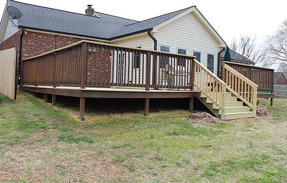 Three bedroom brick ranch near downtown Mooresville with almost an acre. Kitchen boasts granite counter-tops and stainless steel appliances with vaulted ceilings. Sun-room overlooks backyard. Living area features hardwood floors with vaulted ceilings and a wood burning fireplace. Second bathroom has been beautifully updated. Two car attached garage with a built in HVAC unit. Large deck overlooks the 6' privacy fenced backyard. Over sized detached garage features a 10,000 lb two post lift, 2 built in HVAC units, 10' high garage doors, 3 phase power, plumbed for air, insulated, wash sink and surround sound all on a industrial grade slab. This would make a nice machine shop or auto mechanic garage. Lawn shed is behind the detached garage.