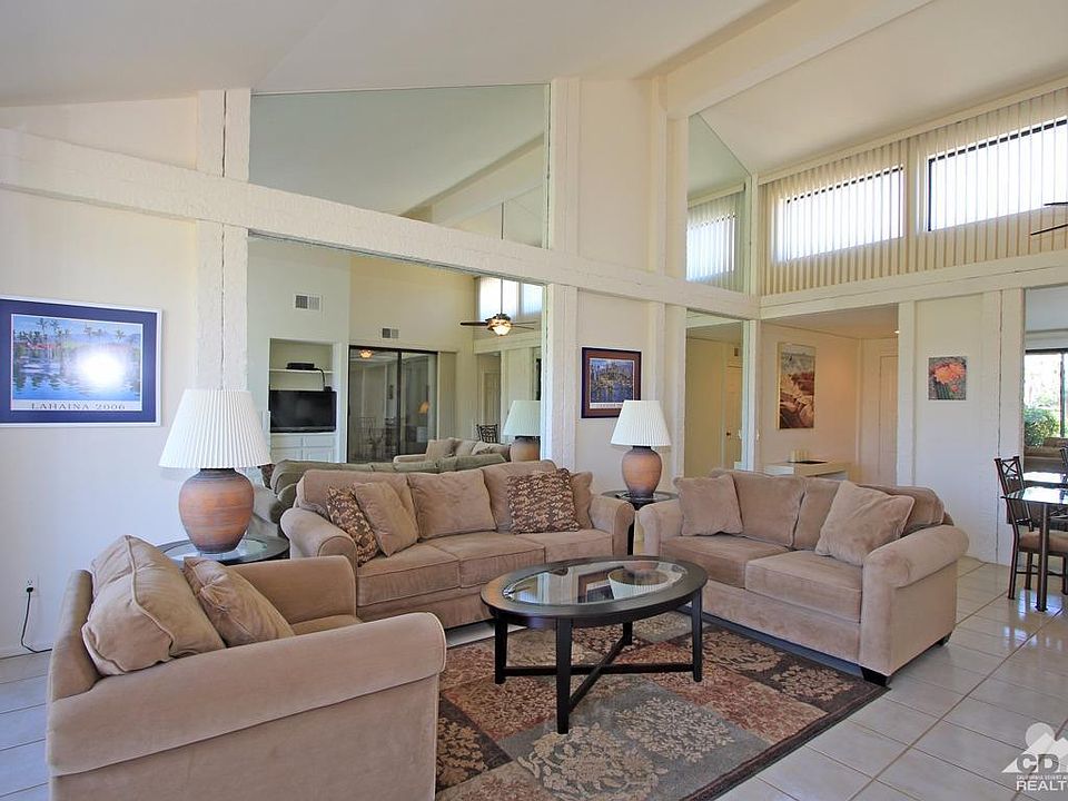 Located high above the White Water Channel and golf course, this Monterey Country Club condominium enjoys truly panoramic views of the course and mountains. You'll never have to worry about an errant golf ball at this location! This 300 Max plan features a beautifully landscaped private entry courtyard, oversized two car garage with room for a golf cart as well as a huge walk in closet in the master suite. The unit is steps away from a community pool and spa and located on a quiet interior cul-de-sac. Relax on the extended patio and watch golfers on the 7th hole of the West course as well as the 2nd hole of the South course. Unit has fresh paint and features new energy efficient windows, new AC, updated flooring and newer appliances and window coverings. Monterey Country Club features 27 holes of championship golf, pickleball, tennis, recently renovated fitness center and full service clubhouse with an active social calendar.