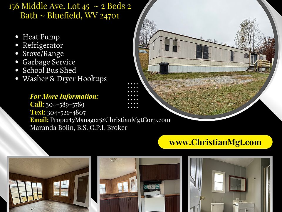156 Middle Ave. Lot 45 ~ 2 Beds 2 Bath ~ Bluefield, WV 24701 LEASE OPTION (Path to Home Ownership): Initial payment: $1,500 with no payments due until the 1st of the following month! Monthly payment: $695/month. Trash & lot rent are included. or RENTAL: Security Deposit: $695. Can be made in payments if needed. Monthly payment: $695/month. Trash & lot rent are included. Sorry, this home is not HUD approved. 2 bedroom, 2 full bathroom single wide mobile home for rent or Path to Home Ownership! Large, level, lot located at The Oaks MHP in Brushfork, WV. Living room features floor to ceiling oversize bay window in addition to more windows that let in an abundance of natural sunlight. Open floor plan with built-in bar & hand washing sink. Furnished with stove and refrigerator. Washer & dryer hook up. The kitchen features an abundance of cabinets and countertop space in kitchen/dining room area. New paint and vinyl flooring throughout! Master bedroom features lots of square footage, ceiling fan, his & her separate closets as well as a master bathroom attached. Master bathroom has a standup shower in addition to a large step up garden tub. Electric furnace heat throughout entire home. Private parking for multiple vehicles. Outbuilding. Lot rent included in the monthly rent. Move in today! Christian Management Corporation Office Hours: Mon-Fri 9:00AM-5:00PM & 10:00AM-2:00PM the 1st Saturday of every month You can view THIS property 7 days a week! Most pets welcome with a $300.00 pet fee per pet and signed pet agreement. Maximum 2 pets. No aggressive breeds due to insurance restrictions. Clean, safe, quiet, crime & drug-free are our priorities for our residents! We support Equal-Housing Opportunities! Good people with good, bad, low, or no credit but stable employment or Social Security are welcome. Criminal Checks: -NO recent felonies in the last 7 years -NO evictions in the last 7 years -NO sex offenders Is this property not what you are looking for? View our other available #homes, #mobilehomes, #apartments, and more on our Facebook or our website! LEASE OPTION (Path to Home Ownership): Initial payment: $1,500 with no payments due until the 1st of the following month! Monthly payment: $695/month. Trash & lot rent are included.