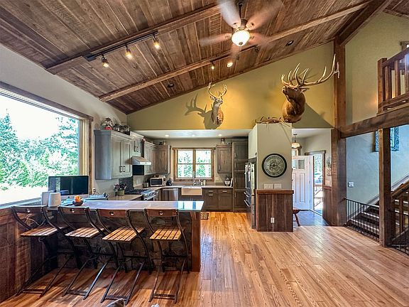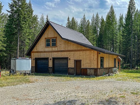 Come home to a stunning, modern home with rustic appointments on almost 5 acres, with a detached shop/garage, bordered by Forest Service on two sides. The great room/kitchen offers wood floors, grey quartz countertops, high-end appliances, a floor-to-ceiling stone fireplace, handsome beam accents and a wood ceiling. There are two 3/4 baths that boast good-looking tile showers and vanities with timeless quartz countertops. The full bathroom has a tub surrounded by tile. You'll love the covered back deck, just off the great room space, which overlooks the treed lot and stairs down to the property. Enjoy mountain views, a meadow space and seclusion, since YOU are at the end of the road! The detached garage/shop has a work area, two garage spaces and an unfinished loft area, with separate access, which could serve as guest quarters, office space or a gym. No expense spared. Builder's own home, so a lot of extras throughout. Call Lynn Kenyon at 406-770-0013 or your real estate professional. Floor plan: primary room on main with its own bathroom and walk-in closet, plus great room, kitchen, dining and entry. Upstairs offers a separate bedroom with its' own bathroom. Egress basement has two bedrooms with over-sized closets, an open recreation/flex space, an enclosed "extra" room, laundry and mechanical. Stairs to all levels are solid wood. Seller previously had a hot tub, so there is a 'pavilion" with a covered pad surrounded by big boulders; wired and plumbed for a hot tub. Chicken coop. Metal roof. Propane tank is owned and buried. 42' by 28' shop. Central air. There is a road to another clearing for an additional shop. Year-round access. Set up for a back-up generator. Approximately 25 minutes to downtown Whitefish, but it feels very isolated and rural with mountain views from almost every angle.