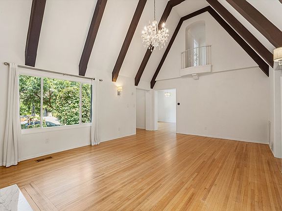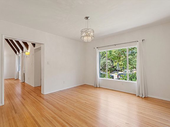 The property layout is a 3 bed, 2 bath in the main house + studio with full bath in the detached guest house. The main house features original hardwood floors, vaulted ceilings in the living room, an electric fireplace in the living room and an Ecobee smart thermostat. The spacious living area flows into a formal dining room and a large updated kitchen with stainless steel appliances, subway tile backsplash, shaker cabinets, and new countertops. A separate laundry room includes a stackable washer and dryer.