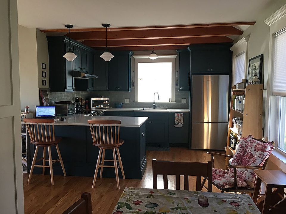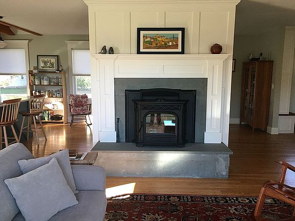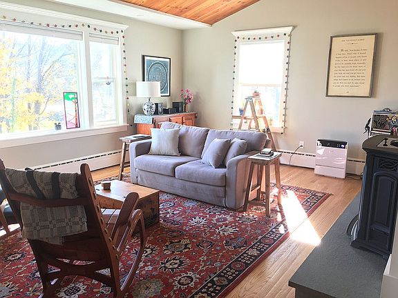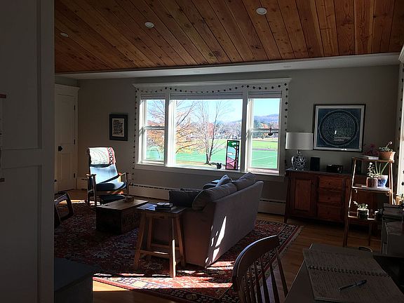 Set back from the road on a large lot, overlooking Williston's athletic fields and offering spectacular views of the Mt Tom Range, sits this sweet home. Enter the remodeled main floor from the new front porch, where everything is new including upgraded electrical, plumbing, and insulation. The open floor plan features a living room with fireplace and new pellet insert, vaulted ceiling, and new windows looking out to Mt. Tom; a beamed-ceiling kitchen with new appliances, countertops, and hand-crafted cabinets; and a windowed space for eat-in dining. Also on the main floor is a new bathroom with walk-in shower, bedroom with built-in window seat and double closets, and a laundry closet with high-efficiency European washer and dryer. Take the stairs down to the lower level where you will be pleasantly surprised by the inviting family room with large new windows, built in bookcases and fireplace with a nearby kitchenette. The second bedroom and updated second bath are also located on the lower level. The dutch door off the family room opens to a large backyard, where you will enjoy privacy and unparalleled views. With living space, bedroom, full bath and separate entrances to each level, this home offers the possibility for accessory apartment/multigenerational living. Newer roof, and heating system and new hardiplank siding, insulation, and rebuilt chimney.