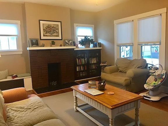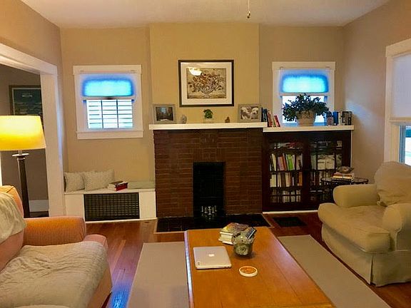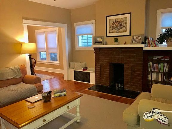 Charming craftsman style home with high ceilings, window seat, hardwood floors, built-in bookcase, and covered front porch with swing. New roof, windows, furnace and AC. Updated kitchen with Cherry cabinets and Corian countertops and bath. Large flat fenced yard with privacy fence. One car garage and parking pad. 2 bedrooms on first floor, and 4 smaller rooms on second floor. Full walk out basement with laundry area, toilet and shower.