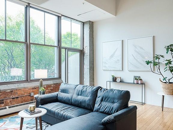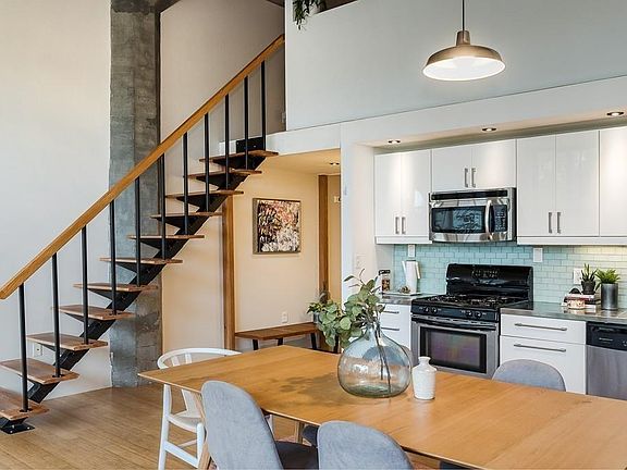First floor condo at the Porter 156 Lofts with soaring ceilings and a private patio. Open concept main level with a stainless steel kitchen, dining area, flexible living area, full bathroom, and in-unit laundry. Sleeping loft with full staircase, privacy wall, and closet/storage. Dramatic wall of windows that look onto the spacious, private patio and park greenery. Central air. Deeded parking space. Common rooftop with seating and incredible Boston skyline views. Steps to East Boston Memorial Park & Stadium, eclectic neighborhood shopping and dining, and the Blue Line at Airport or Maverick with frequent, fast service to Downtown.
