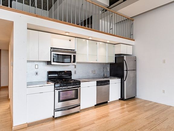 Live the true loft lifestyle at Porter 156 in East Boston! This first floor unit blends modern updates with industrial aesthetics and has large factory sized windows which flood the unit with natural light. Hardwood floors throughout with an updated kitchen including stainless steel appliances, granite counters and plenty of cabinetry. One of only a few units in building that includes a space which can be used a bedroom or good sized office space as you enter the front door. 14' ceilings and and modern pendant lighting in main living space. Updated bathroom, in unit laundry, central AC and an additional 96 sqft in loft up stairs. Building is professionally managed and amenities include a large community room and shared roof deck with sweeping views of Boston skyline. One deeded parking space included and building is in close proximity to Maverick Blue Line, a burgeoning restaurant scene, Logan Airport, Jeffries Point waterfront, Piers Park, I90 and a quick commute into Downtown Boston.