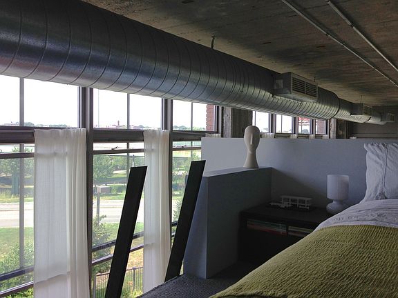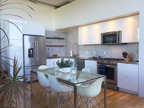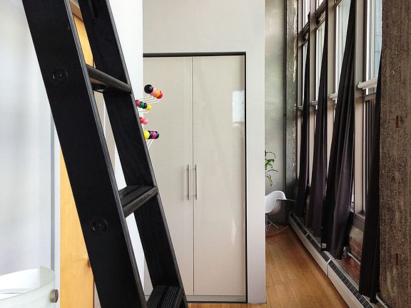 Unit 201 is one of only eight corner lofts at 156 Porter Street. It is lined with windows and has both northeast and northwest exposures, with views of the park, Logan Airport and Charlestown. In addition to the deeded square footage, the mezzanine has been finished as an office/guest area. The renovated master bedroom area includes built-in clothes storage and A/V capabilities. The kitchen was completely renovated in 2017 with all new cabinetry, custom stainless steel counters, walnut shelves, honed marble tile and KitchenAid appliances.
