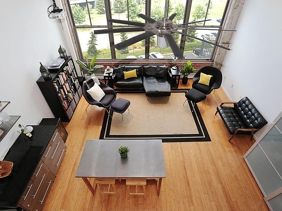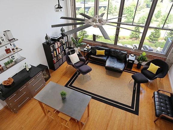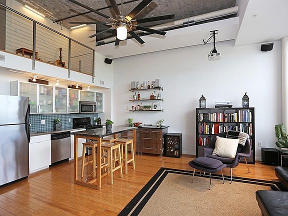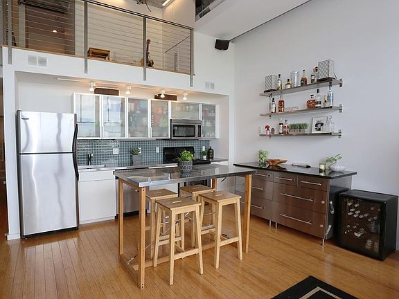 Sophistication meets modern industrial in this fabulous 2 bedroom, 2 bath loft with garage parking & sprawling roof deck! Dramatic 18' foot ceilings soar above 2 levels of living while highlighting original factory detail & warehouse windows with picturesque park views. 21'x 20' open concept floor plan with HD ceiling projector & built-in surround sound is prime for entertaining year round. In warmer months, take a short elevator ride to the roof deck lounge for sunsets & skyline views! Kitchen includes stainless appliances w/gas range plus large granite/stainless island. Bamboo flooring & custom lighting throughout, 27" front-load washer/dryer. Head upstairs to private master suite w/mezzanine seating area, spacious closet, master bath with spa-like, Italian porcelain walk-in shower, floating vanity & Porcelanosa bath fixtures. Central A/C, pet friendly, professionally managed building. Walk to Maverick Sq, parks, restaurants, shops, fitness & water taxis! OFFERS DUE BY 8PM MON 6/18!