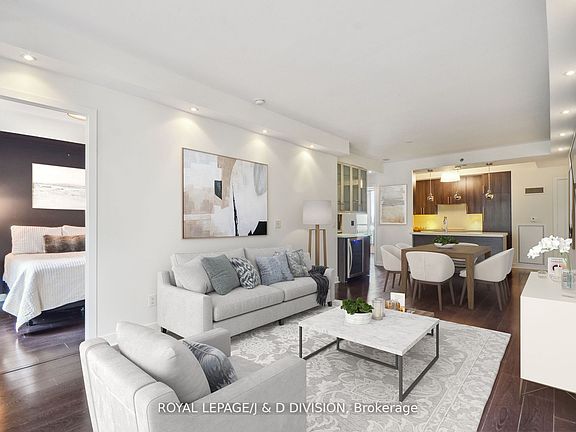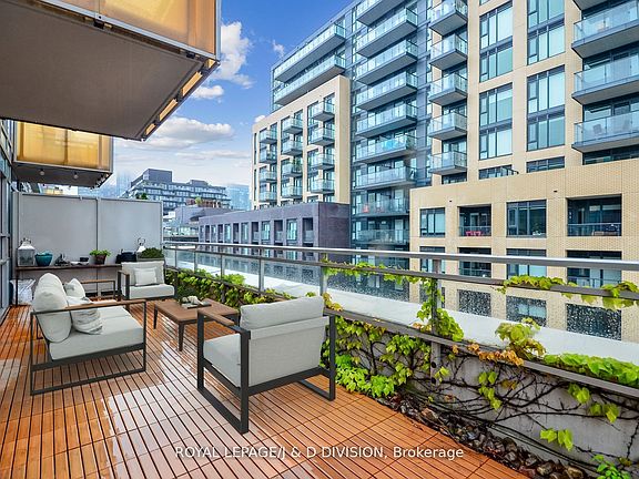 Premier Portland Street Entertainer's Dream. With one-of-a-kind outdoor private terrace, open concept modern kitchen, spacious living and dining rooms - two bedrooms plus den/3rd bedroom this over 1100 Sq.Ft plus 300 Sq.Ft. Terrace has limitless potential. Gourmet European-inspired kitchen with sleek integrated appliances and rare large pantry. Custom-designed dining room bar built-in with lux beverage fridge (2025). Enjoy the convenient generous parking spot and private locker. This ultra-modern 7-storey boutique building with magnificent glass facade is a style statement at the heart of the Queen West. Enjoy convenient access to Loblaws & Starbucks direct from the building. Walking distance to an array of world class restaurants, shops, & entertainment options. Outstanding building amenities include newly renovated lobby, concierge, huge rooftop deck (on the same floor as unit), state-of-the-art gym and chic party room. Come home to luxury, comfort and convenience on Portland Street.