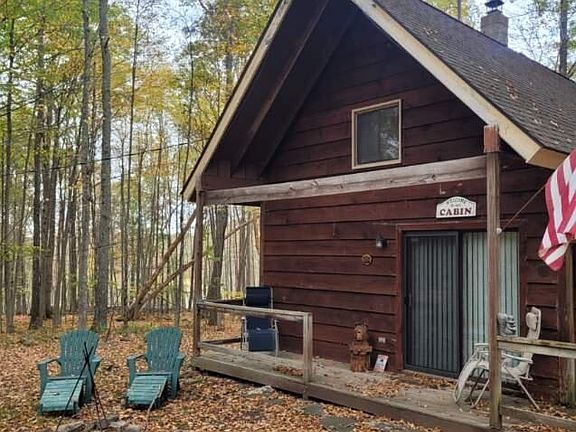 This cozy Pocono cabin is a great getaway tucked away in the woods for privacy and relaxation. .99 acre partially cleared flat lot in Pine Creek Estates. 2 bedroom + sunny heated BONUS room, living room and eat in kitchen. Wood burning stove and long front porch to enjoy those rainy nights.20 minutes to Shawnee Mountain, 20 minutes to Shopping, 25 minutes to Camelback Resort and Delaware Water Gap.