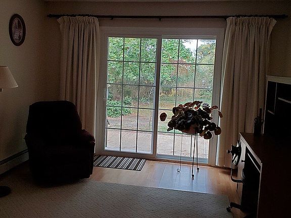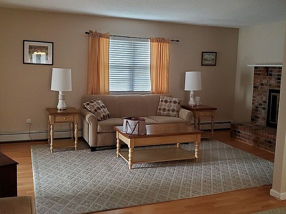 Move in ready! Atlantis (largest) model ranch in desirable Seaview Village. This spacious 2 bedroom home is 1,356 sq. ft., and features a Master Bedroom with full bath and walk-in closet, also boasts a large second bedroom, full main bath and laundry room with direct access to one-car garage with automatic overhead door. The house is light and bright with lots of windows, to be replaced before closing. Open floor plan with sliding doors to outdoor patio featuring a private backyard with water views. Working brick fireplace, hot water baseboard heat, and central air - all mechanicals have been replaced in 2013. Low monthly association fee includes lawn maintenance, snow removal, and much more. Clubhouse has a pool table, bocce court, pool and patios. Pets allowed.