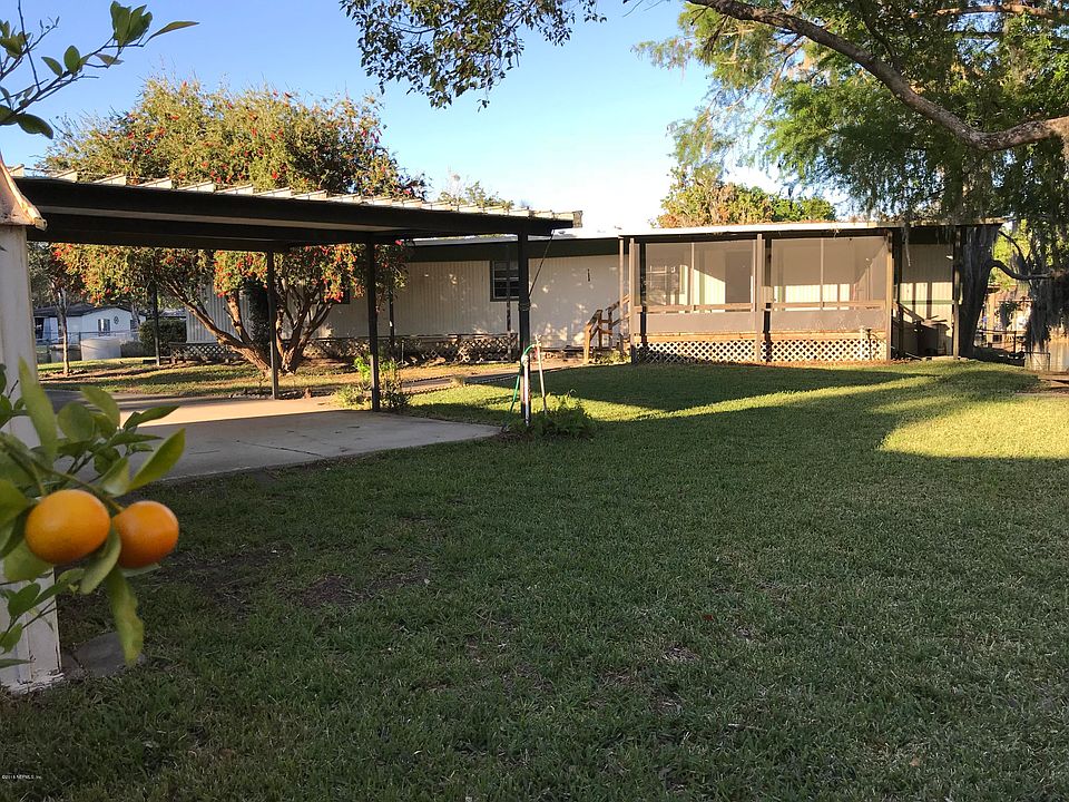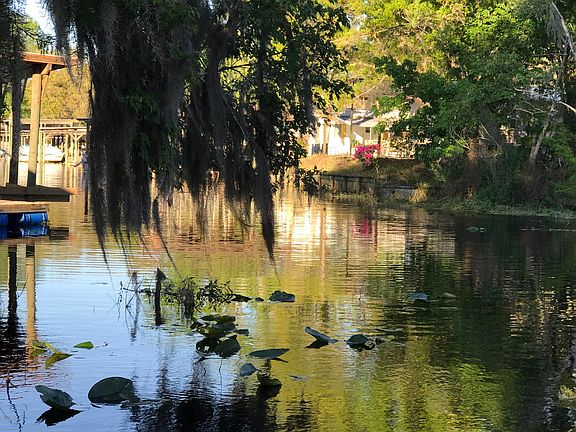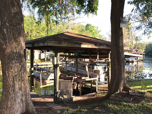 Serene Retreat! A double lot offering picturesque views of the water, dock with boat lifts, a 2 bedroom 2 bath mobile home, a 2 car covered parking and 2 sheds. A perfect place to retire or weekend getaway destination. Seller measures approximately 140 ft of water frontage, however Buyer to verify.Mobile home in need of some TLC.