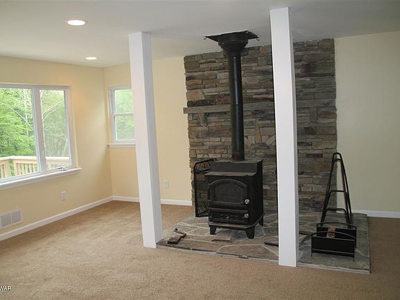 - Fireplace features: Free Standing, Wood Burning Stove, Stone, Living Room