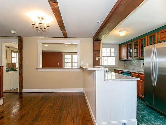Come fall in love! This adorable antique Cape will charm you with her gorgeous and recently refinished hardwood floors, beamed ceilings, and built-ins galore! Set on a pastoral acre of land with several outbuildings; one fully equipped as a home office. Meandering brick pathways take you throughout the mature plantings surrounding the property. Large mudroom/den has easy care tile floor and wood stove for those chilly nights. Eat-in kitchen with granite breakfast bar, stainless steel appliances, and wall oven. The front facing living room offers built-in bookshelves, brick fireplace and wide plank flooring. This home has been updated and is move-in ready but still maintains all the character of a bygone era. First showings at brokers tour/open house. Home Warranty included.
