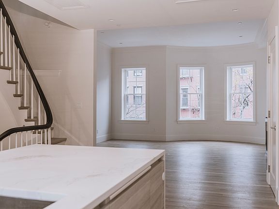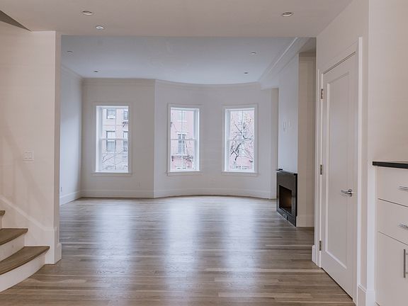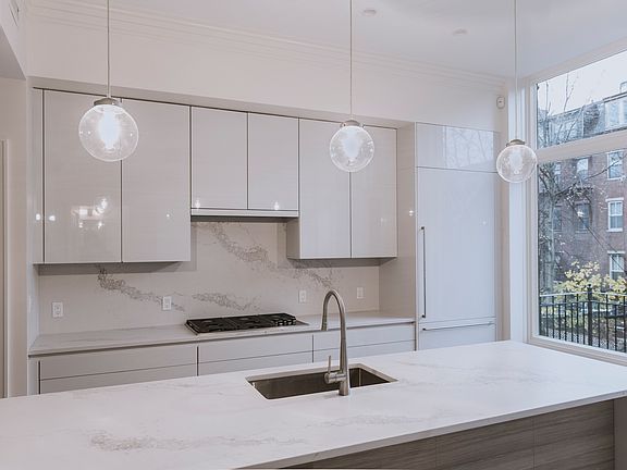 Impressive renovation of this Victorian Brownstone, designed by local architect Guy Grassi. Three floors of lavish living - featuring 1 parking space, and two decks. Second floor boasts an expansive living room dining room and kitchen combination with built in shelving, and custom Marvin/JB Sash floor-to-ceiling windows. Kitchen designed by Leicht - has white Calacatta Nuevo Caesar Stone Island, custom Flat panel white semi gloss cabinets, Sub Zero, Thermador, Wolf, Bosch, and Uline appliances. Direct access from kitchen to an elegant balcony with a southwestern exposure. The Master bedroom utilizes the entire third floor, and features a vast walk-in closet (allowance for customization), an all statuary marble bathroom with two-sink vanity, and study (or small bedroom). Fourth floor consists of 2 bedrooms, each w. ensuite bathroom and separated by sizable family/play room area w. access up to an amazing roof deck with 360º views of the Boston Skyline. No detail spared here.