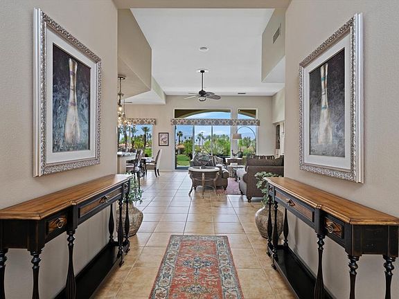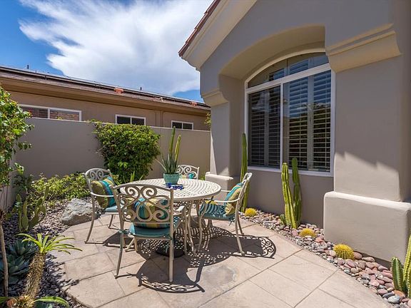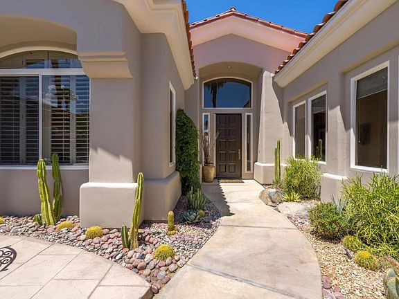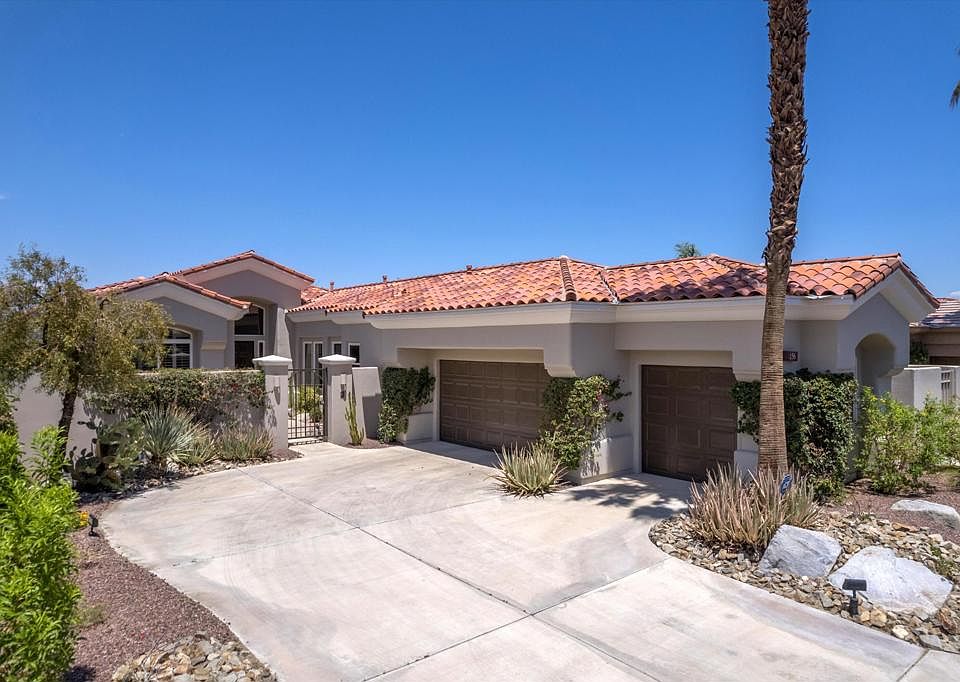 Love where you live! Located at the Indian Ridge CC, one of the most sought-after communities in the Coachella Valley. Known for its two fabulous 18-hole golf courses, great tennis, and pickle bar courts, bocce ball, active club with an array of activities, luxurious spa, and well-equipped gym, and Pilates studio. This popular Bougainvillea 1 floor plan sits on an elevated lot with views overlooking the Arnold Palmer Grove Fairway #12. Whether you are looking for a permanent home or a vacation destination you can't go wrong with this property which is currently the lowest priced home in the community. Open floor plan boasts a great room with wet bar including fridge, fireplace, double sliding glass doors out to the patio and lush green golf course. Spacious Primary suite opens to back patio also with golf course views and adjoins a large bathroom with sunken tub, and double sinks. Two more ensuite bedrooms at separated ends of the home providing guest privacy. Window treatments throughout include automatic blinds and plantation shutters. Fully furnished so all you need to bring is your toothbrush (see inventory list). Monthly HOA includes trash, wi-fi & cable, gardener, exterior painting, and roof. Attached 2 car plus golf cart garage. Quiet street, close to 3 of the 38 community pools. Currently NO wait Club Membership available. Minutes from Stores, Restaurants, Entertainment, El Paseo Shopping, and the world-famous Tennis Gardens.