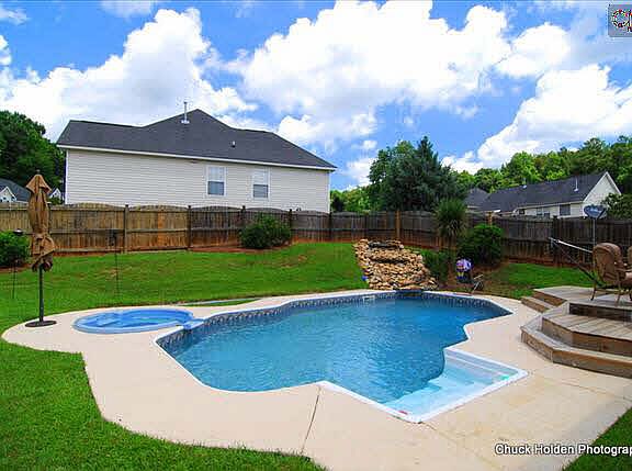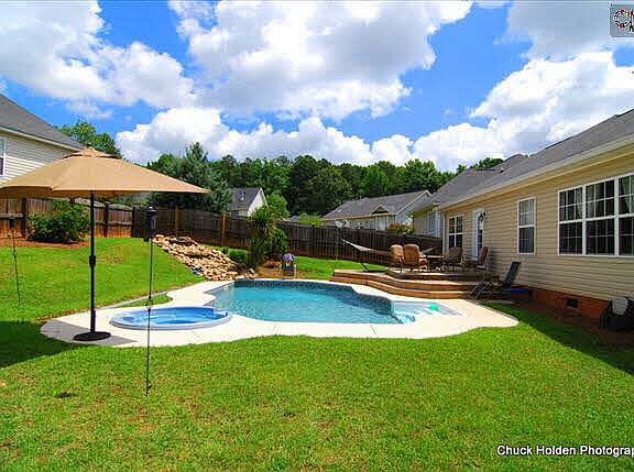 Great one level home in the heart of Lexington, with a beautiful and relaxing in ground pool and spa, plus an oversized deck with privacy fenced in back yard. Open plan with hardwood floors in great room/dining and hallways. Vaulted ceilings, Spacious granite kitchen with pantry and dining area. MasterSuite overlooks pool and includes valued ceiling, garden tub and separate shower. Large finished bonus with closet is the 4th bedroom. 2-car garage has been converted to large den but could easily be converted back to garage.
