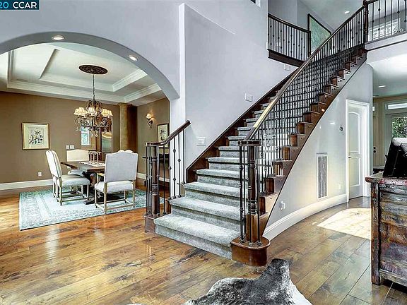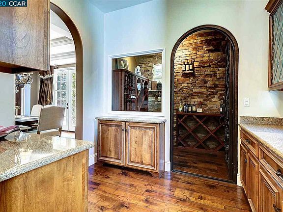 Secluded Diablo Colonial - newer construction built in 2005. 4 bedrooms, plus office. Separate theater room and additional loft/bonus room on second level. 4 car garage (2 car attached, 2 car detached). Sweeping staircase. Light and open design. Wood plank floors in most areas. 5 fireplaces; den, living room, family room, master bedroom & backyard covered patio. 4 bedrooms with en-suite bathrooms. Open spacious kitchen with walk in pantry, island, two refrigerators, butlers pantry, large bricked wine cellar room, and much more. Large flat lot; over 1/2 acre. Potential for au-pair at 2 car detached garage. Great home for flex living. Master suite on first level.