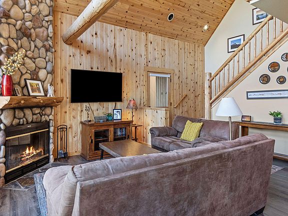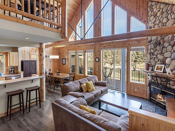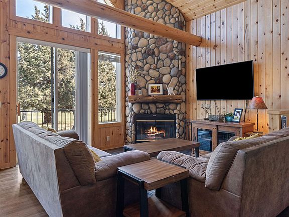 From your private back deck, take in the view of the 17th Green of the Ridge Course, down the Fairway to Smith Rock! Make this chalet your personal retreat or enjoy the strong rental income! The vaulted great room features natural light from the wall of windows, a wood burning fireplace, knotty pine accents and recently updated kitchen. Also on the first level are 2 beautifully appointed bedrooms with a full bath and laundry. Upstairs, the loft area offers multi use opportunities not to mention a Smith Rock view! The primary features a soaking tub, vaulted ceiling and amazing storage. This property conveys turnkey with higher end furnishings. Recent upgrades include freshly painted exterior, new roof, decking and railing. Newer hot tub. New heat pump/furnace and newer hot water heater and LVT flooring