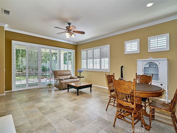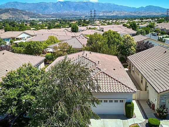 This beautifully maintained Trillion home is in the gorgeous Solera Oak Valley Greens 55+ Community. As you walk into the inviting entryway you will be greeted by a cheerful open floor plan with a primary bedroom with an ensuite complete with a separate shower and a walk-in jet tub and office and a second bedroom connected to its own bathroom for your guests who won't be eager to leave as they relax in your tranquil easy maintenance backyard. You'll love having every window covered in plantation shutters and crown molding throughout the home. Solera is surrounded by the gorgeous San Gorgonio mountains and offers a beautiful clubhouse with tennis courts, bocci ball, a gym, and an inviting pool area along with many more amenities. This amazing, gated community also comes with 24-hour security plus cable and wi-fi are included in your HOA. This house is just waiting for you to make it your special home.