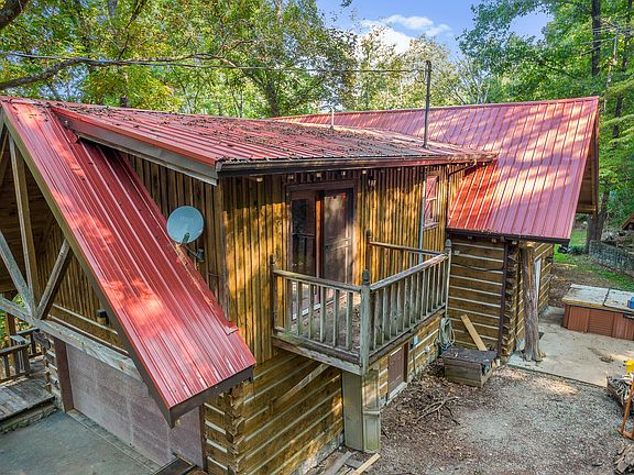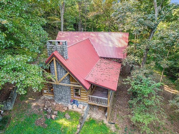 Custom built Canadian Style log home situated in the midst of 91/2 acres and looking on Mt. Pilot and Bays Mountain. Secluded, yet convenient to 1-81, Sevierville, Knoxville and Smokey Mountains. Constructed of White Pine 10 inch square D-log design and dovetail ends, this home is like an insulated cooler. It has Masonite Insulation, and even under the house is fully insulated which is why the fireplace, when used, will generously heat and trap it for days. Seller never needed to install a heat pump and only used window unit for air. There is a wall propane heater that is used in colder months. The new roof hangs on a 12 on 12 load design which is great for melting snow, if any. The great room is just that, GREAT. Enough room for a pool table and oversized comfy furniture. Keeping the two ceiling fans running has been a good way for the seller to keep the cabin at same temp most times. A Walnut Mantle with porcelain concrete moldings that resemble an old castle and arched window panes are also part of the design of the room. In the dining room, you'll see stained glass fixtures and the staircase leading to the upper floor which contains the bedrooms and a flex space for a possible office or another den. The primary bedroom has balcony overlooking the back of the home and a custom bathroom with heartwood pine and cedar trees made mostly from the land itself. The kitchen comes with bay window, pantry and island with cooktop that doubles as indoor grill. Beneath the sub-flooring, pre-treated hemlock was used in constructing. (Seller will give $1000 towards new kitchen flooring as there was a small leak from the refrigerator). On the exterior, some items of interest are the semi-circled retaining wall, designed to hold the blunt force. Just as the garage was also designed this way with the center beam holding the weight. You'll also find a 12x12 woodshed or storage shed with chinking like a tiny log home, another tin storage building and a 12x12 outbuilding.