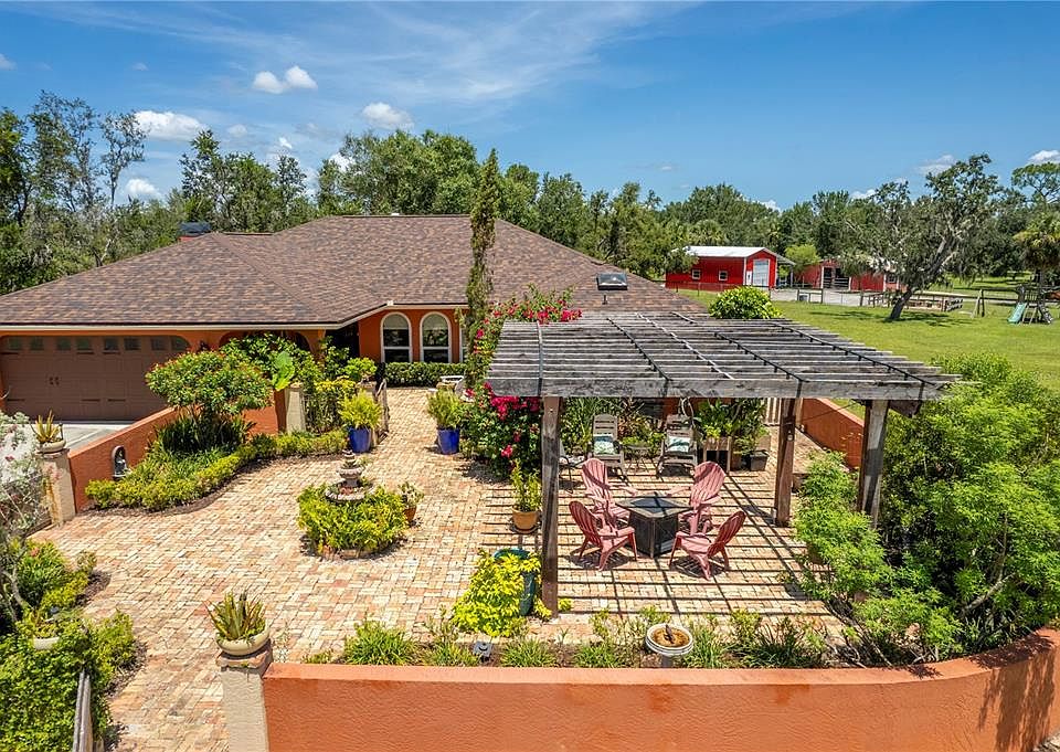 Introducing this breathtaking Spanish-style pool home nestled in the heart of Prairie Creek Park. Impeccably move-in ready, the property spans 5.75 acres, fully fenced and embraced by stunning mature oaks, offering a serene and private retreat with creek frontage. A delightful front courtyard welcomes you with Chicago reclaimed brick and a charming pergola, setting the stage for the elegance that awaits. Relax in your own private oasis, complete with custom-designed heated pool equipped with water features & swimouts, surrounded by the soothing sounds of nature. French doors lead to the fully screened pool and lanai, providing a seamless connection between the interior and the picturesque outdoors. Inside, the main living areas boast reclaimed wood flooring from the historic Ft. Ogden schoolhouse and beautiful resealed Spanish tiles, infusing the home with timeless charm. The living room features an exquisite onyx-tiled fireplace, adding a touch of warmth and sophistication. The master suite is a luxurious retreat, with French doors leading to the lanai, two walk-in closets, and bathroom featuring tiled counters, dual sinks, and a glass shower. There is also a spacious den/office that can easily serve as a fourth bedroom, facing the courtyard with inviting natural light. The second and third bedrooms are generously sized, each equipped with walk-in closets. The second bathroom opens to the lanai for convenient pool access. The kitchen is a chef's dream, showcasing high-end wood cabinetry, travertine backsplash, stainless steel appliances, new countertops, an island with a cutting board surface, and a reverse osmosis system. Laundry room/mud room offers convenient exterior access for added practicality. Property also boasts two artesian wells. To cater to your equestrian passions, the property includes a 3-4-stall barn, complete with a tack and feed room, and round pen. PLUS, there is also a metal shop complete with electricity with enclosure for storage and carport area for your all your toys. There's no better place to enjoy your horses than amidst these exquisite grounds! Prairie Creek has almost 20 miles of private trails at your doorstep, horseback riding becomes an enchanting experience. Alternatively, take your kayak or small boat down Prairie Creek, exploring miles of picturesque waterways for fishing and adventure. This home has been thoughtfully remodeled, with updates including a new July 2023 roof, 2022 AC, and many other modern features, ensuring a worry-free living experience. This home offers a harmonious blend of luxury, functionality, and natural beauty. Embrace the unique opportunity to make this stunning property your forever home!