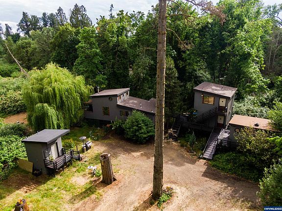 A magical and unique home filled with artisanal touches. Main house has a sleeping loft, full kitchen with dishwasher, & large bathroom with soaking tub. A 1 bd guest cottage with kitchen & full bath sits above flex space with a half bath, walk in closet, & W/D. Airbnb potential! There is also a 14’x16’ Workshop & a well house plumbed for a W/D. Nearly 2 acres and 300 ft of frontage on the Little Pudding River, including a private beach, mature trees & tons of privacy. Easy commute to Portland or Salem.