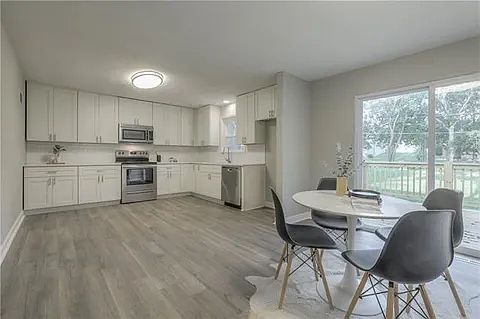 This home boasts new flooring, a kitchen with quartz countertops, and new appliances.