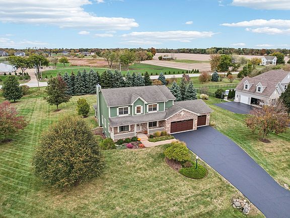 Custom-Built Home on 1 Acre in Huntley! This stunning 4-bedroom, 3.1-bath custom-built two-story home offers the perfect blend of quality craftsmanship, comfort, and modern updates-all set on a beautifully landscaped 1-acre lot with mature spruce trees providing privacy and shade. Step inside to find gleaming hardwood floors and 9' ceilings with elegant crown molding throughout the main level. The cherry kitchen features stainless steel appliances, solid surface counters & breakfast bar opening seamlessly to the inviting family room with a brick fireplace. Enjoy formal entertaining in the dining room, complete with a built-in hutch and serving counter, or utilize the converted living room as your personal home gym. Upstairs, you'll find 9' ceilings, a convenient 2nd-floor laundry, and a spacious primary suite with a private office/nursery, huge whirlpool tub, double vanities, separate shower, and walk-in closet. The finished basement is an entertainer's dream, featuring radiant heated floors, a custom wood ceiling, a full bath, and a beautiful custom bar with a sink and refrigerator. Additional highlights include radiant heated floors in both the basement and the oversized 3-car garage, epoxy-coated garage floors, powder-coated cabinetry, and a finished ceiling. The home has been freshly painted and features recent mechanical updates-Furnace, A/C, and tankless water heater all replaced within the last 5 years. Relax or entertain in the 3-season room or on the stamped concrete patio and walkways. This home truly has it all-style, functionality, and attention to every detail. A must-see home that perfectly combines luxury living with everyday comfort in desirable Huntley!
