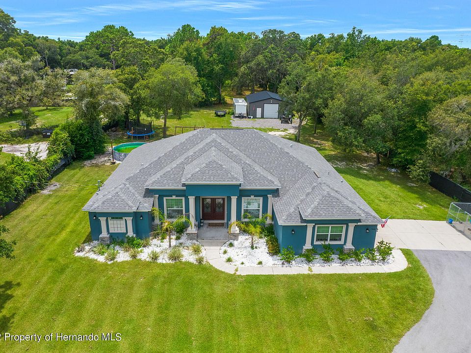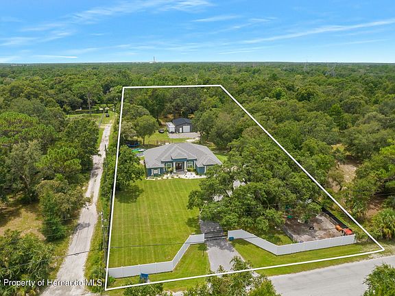 HUGE PRICE REDUCTION...Seller motivated for personal reasons. INCREDIBLE ALMOST BRAND NEW UPGRADED LARGE CUSTOM HOME!! 3 bedrooms + 2 bathrooms + 2 car garage + detached garage (30x40 with a 2-car post lift) + large covered lanai (34 x 8) + large brick-paver patio area with firepit all nestled on 2.11 PRIVATE acres!! 2.604 sq ft living; 3,393 total. The builder is Dream Custom Homes (Award-Winning Custom Builder locally for 25+ years) - this is the Builder's personal custom home! Completely fenced with an electric gated entrance and paved driveway!! Everything is basically brand new and full of upgrades...you don't have to wait for it to be built or take on unknown construction costs! Gorgeous landscaping and yard! Stunning, high coffered ceiling with faux beams in the main living room with triple glass, pocketing sliders offering views of your private estate - NO REAR NEIGHBORS to look at and NO ONE TO LOOK AT YOU!! Every room of the home as high tray ceilings and lots of natural light to make this home feel spacious, light, bright and cheery! Gorgeous high-end fixtures, lighting, and finishes! A kitchen to envy that rivals the ones in the magazines - with large granite breakfast bar, real wood white shaker cabinets, designer tile designs in the backsplash and other feature areas! Top of the line appliances with stainless steel appliances, convection oven, convection microwave, and even a connection range hood!! The upgraded kitchen is open to the large family room and dining room with walk-in pantry!! The split floor plan offers complete privacy to the large master suite with its award-winning ensuite bathroom design, dual vanities and sinks, walk-through, rainforest shower, modern soaker tub, huge walk-in closet, and porcelain plank tiles in the master bathroom! Behind the kitchen the home opens up into another large family or bonus room to offer the family a place of their own with the 2nd and 3rd bedrooms and second bathroom off this extra family/bonus room!! The second bathroom is also a pool bath with outside access to the large covered rear lanai! Built with energy conservation in mind, this home offers cell fill in all the walk, insulated LOW E, double paned windows, and R-38 blown-in insulation! Built in 2020...this home is basically brand new!! Enjoy letting your family and pets outside to play and run with all your land and privacy surrounding you! Large, beautiful front yard lends to the appeal of this home as you drive in the electric, private gate and up the driveway! Enjoy the back yard with a detached garage offering additional covered parking, workshop, 2 car lifts, power, water, concrete floor and more!! The land continues back behind the detached garage for about another acre offering private wooded property so you don't have neighbors on otp o of you! NO flood. NO HOA - so bring your ATVs. camper, RV, boats, trailers, horses, chickens, toys...BRING IT ALL!! High-speed, hard cable internet!! Located on Little Ranch Road (paved) just off Shady Hills Rd minutes to the Suncoast Parkway with QUICK and EASY access to Tampa for work and play! ONLY 35 minutes to Tampa International Airport! Less than 1 hour to 2 of the TOP US BEACHES in the country!! A little bit of land brings the freedom and privacy you cannot get in a neighborhood - yet you are so close to everything here!! Call today to schedule a showing for you and your family!