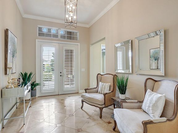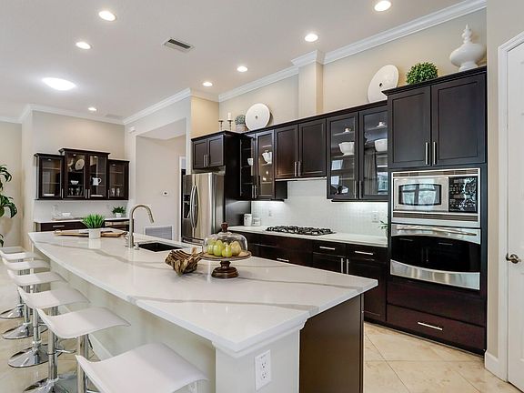Former model home in Country Club East. Designer upgrades accentuate the open floorplan, providing style and thoughtful conveniences to your way of life. Boasting 2,700 square feet, it feels even bigger given its open layout. The iron chef is center stage in the magnificent gourmet kitchen which was just refurbished, equipped with all BRAND NEW, *never-used* kitchen updates including: designer quartz countertops, white and pearl marble backsplash, sprawling 14" luxury quartz Cambria eat-in island for seating of 6, cutting-edge granite-style, scratch-resistant sink, modern faucet, soap dispenser, and kitchen hardware! Also included are modern stainless appliances, a five-burner gas cooktop, quality wood cabinetry with under-cabinet lighting. Guests enter through double glass doors to natural light filling the home presenting 11'4" high ceilings with crown molding and stunning Maxima-Navona polished porcelain tile. Envisioned for turning any event into a special occasion, the desirable indoor-outdoor layout invites you to entertain guests with ease as festivities can spill over from the impressive great room and grand kitchen to the oasis-inspired screened lanai and in-ground pool complete with ceiling sound system, inside and out. Open the expansive 8' sliders with transom window for a seamless extension of the great room, where you can pour drinks from the built-in wet bar featuring a wine refrigerator. Epitomizing the Florida lifestyle, the screened lanai provides resort-quality relaxation where you get the soft sounds of fountains and enjoyment of the heated pool with a sun shelf. For fun-filled weekends, the grill master can fire up the barbecue in the outdoor kitchen with oversized grill and stainless hood exhaust, with mounted wall TV nearby. Providing that your every need is met, the master retreat boasts brand-new *never used* floors, a spacious sitting area with TV mount, built-in cabinetry, large under counter beverage fridge, and illustrious en-suite spa bath including dual vanities, a walk-in shower, garden tub and over-sized walk-in customized closet. Two additional, upgraded bedrooms - one with an en-suite bath and brand new, *never used* floors- offers separation from the master and versatility to your lifestyle preferences. There is also an oversized laundry room featuring extra storage and space for an additional small office or craft room to meet today's changing demands. Thoughtful detail and insight went into every improvement, including tray ceilings, plantation shutters, central vacuum system, hurricane impact windows, energy-efficient tankless water heater, and a rare find, *central-air-conditioned* 3-car tandem garage with extra space for the enthusiast. Marvelously situated in a delightful cul-de-sac in Country Club East, with community pool, entertainment area and spa just a short walk away on the same street, is the life you've always deserved within a gated, family-friendly community full of high-end amenities.