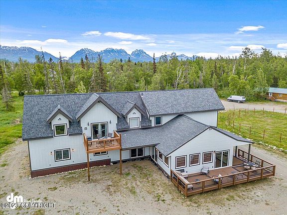 Introducing the property you have been waiting for on Lazy Mountain! This exceptionaly unique and rare farmhouse-style home are better than brand new! Ask about $12,000 credit for NEW kitchen countertops of buyer's choosing! Situated in a highly coveted location, minutes to downtown Palmer and less than an hour to downtown Anchorage. Stunning prow front design, vaulted ceilings and large windowsthat frame breathtaking mountain views. Enjoy the outdoors from the wrap-around deck and sunroom. Two kitchens, newer cabinets and appliances, bedroom and bathroom on the main level, oversized two-car garage with 12' ceilings. This home provides ample space, privacy, and convenience. Set on a privately treed, usable 8.71-acre lot. Includes horse fences, small barn, a large circular driveway, and an additional cabin with a separate septic system and electric meter. The property features a new 6-bedroom septic and well, a new roof, heating system, and has been completely remodeled and expanded from 2021 to 2023. Freshly painted exterior and interior. Ideal for horse and farm animal enthusiasts. Don't let this one-of-a-kind gem slip away! Schedule a showing today and unlock all the endless possibilities.