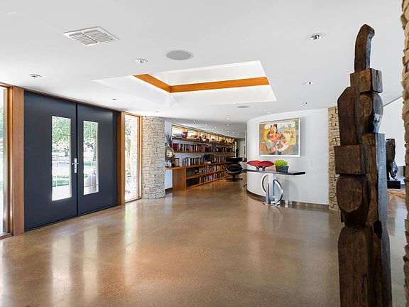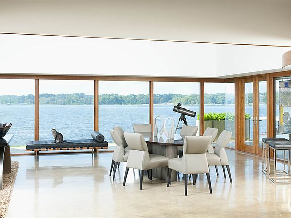 "The house kneels quietly by the water, a stucco and stone structure marked by generous expanses of glass walls that provide breathtaking views of the outdoors. Inspired by Frank Lloyd Wright's unrealized plans for his Ralph Jester House, the homes circular architecture is like nothing before seen in the area: a serene wooded lakefront enclave just 20 minutes from downtown Tyler." This quote from Luxe Magazine describes perfectly this spectacular home situated on over 5 acres with 1000 feet of shoreline, the location establishes itself as one of the most valuable and pristine lots on Lake Tyler. The intentionality of the design starts with the gated entrance showcasing the circular metal work on the gate. Upon entering the water view greets you inviting you to breathe in peace. The main living room and dining room are encased in glass and open to the kitchen. The kitchen is built in a circular shape with custom cabinetry by Reznikoff, Sub Zero freezer and refrigerator,appliances by DCS, and stone countertops. The home utilizes a smart home system to control the lighting, sound, security system and electric window shades. The home theater has a state-of-the art projection system and a wall of Nano doors creating an indoor/outdoor room open to the outdoor kitchen. The master suite invites the outdoors in with views to the lake beyond. There is also a guest room with bathroom and office. The hallway with built in bookshelves is a favorite of the current owners! The outdoor space provides ample outdoor seating along with a full bath and outdoor shower next to the circular infinity deck leads you to the boat house with 2 boats slips and 2 jet ski lifts. This gated lake front architectural gem offers privacy and luxury all within 2 hours from the Dallas area.