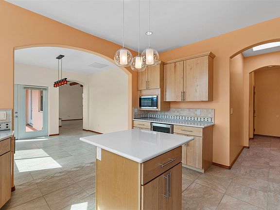 Kachina Ridge 3-bedroom, 2-bathroom residence, crafted by Master Green Builder Arch Sproul, showcases numerous custom upgrades and green features, making it an eco-friendly choice for the modern homeowner. Wide doorways, nichos, and porcelain tile and hardwood hickory floors throughout. The solid knotty pine doors add a touch of rustic charm, while the enlarged living room with log vigas and a gas fireplace with a flagstone hearth, invites you to unwind in style. The bright, east-facing kitchen is appointed with a center island, solid maple cabinets finished in natural tones, Silestone quartz countertops and Energy Star Appliances.  The primary suite includes a walk-in closet and en-suite bath with soaking tub and walk-in shower. The two guest bedrooms offer versatile options, whether you need a studio, office, or additional space for visitors. Plus, a bonus room awaits your creativity—perfect for exercise or artistic endeavors. Step outside to the expansive back portal featuring a tongue and groove ceiling, where you can enjoy al fresco dining. The front and backyard gardens are thoughtfully designed with low-water perennials and buried irrigation lines. Enlarged, fully finished garage with 10-foot ceiling and overhead storage. Equipped with 30 photovoltaic panels installed by Positive Energy, you can enjoy lower energy costs while reducing your carbon footprint. The Kachina Ridge Subdivision homes are located adjacent to a greenbelt with no through streets. Convenient city location close to shopping, restaurants and the Santa Fe Plaza.