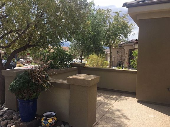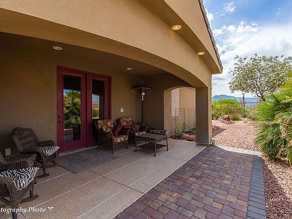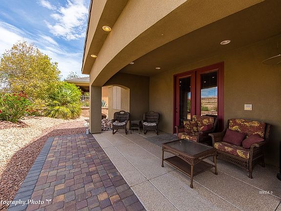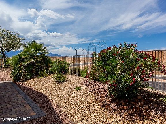 This gorgeous home is located in Sierra Ridge, a desirable community north of I-15. Surrounded by endless desert bluffs and wide open spaces, this home is situated on a perimeter lot offering awesome views of the southern mountains, Flat Top Mesa and beautiful desert scape. The private front courtyard faces the eastern mountains and the back covered patio has been extended with Pavers allowing ample room for outdoor furniture and entertaining. The colorful landscaping is very low maintenance and the yard is mostly fenced. The home is spacious and open and the room sizes are generous. Exceptional Maple Hardwood flooring accents the home and the bathrooms have attractive tile flooring and surrounds. The home has 8' doors, vaulted ceilings, warm paint tones, upgraded cabinetry, water softener, R/O, solar screens and a security system. The laundry room has upper cabinets and the half bathroom is conveniently located. The extended garage is lined with cabinets, overhead storage compartments and a work bench, optimizing the space. The HOA fees are minimal and the location is ideal for outdoor fun. Just steps from the front door is miles of desert, perfect for walking and ATV enjoyment.