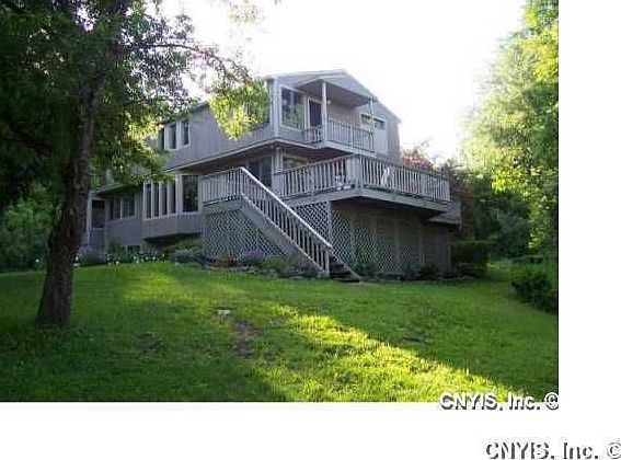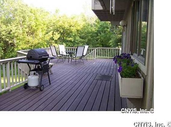 Custom, elegant, contemporary home on over 7 acres is a private luxurious retreat, yet only minutes to Syracuse! Set back from road, the circular drive takes you through the lush, landscaped grounds. Contemporary home has ""Craftsman"" details, oak floors with inlaid tile, large oak kitchen designed for 2 or more cooks, with counter bar seating, Kitchen Dining Family Combo with towering ceilings walks out to huge deck. Master suite with dual shower heads & balcony. Custom 2nd floor laundry room. Home Office. Amazing energy efficient heating system uses oil, coal &/or wood! Garage studio/workshop has separate heater. Much More!