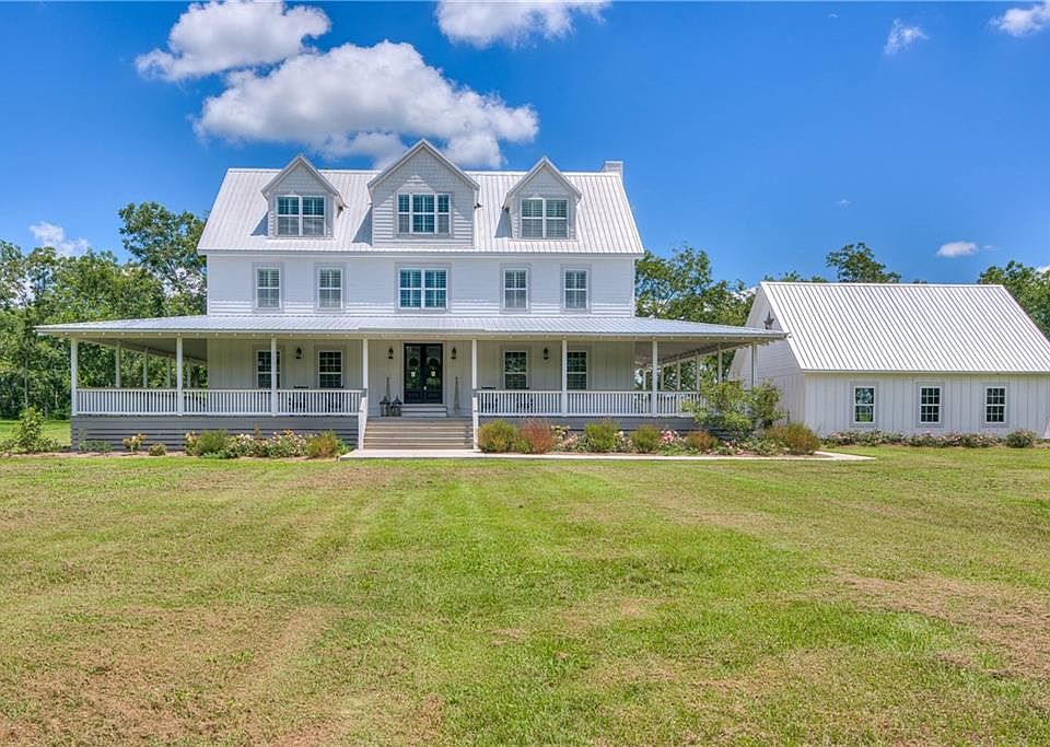 This 4 BR, 4 1/2 BA modern farmhouse was built for those who value excellence! Features include ship lap, heavy baseboards, thick modern crown, barn doors, designer lighting and marble countertops throughout. Kitchen boast Pro Gourmet appliances inclusive of 48" dual fuel Wolf range, 42" Subzero frig, ice maker, microwave drawer, custom vent hood, dishwasher, 15' island, 2 touch activated faucets, 43" Pro sink, side sink and coffee bar. Bedrooms are oversized and include attached bathrooms. The master suite offers a huge shower with 5 outlets and steam shower, volcanic limestone tub, oversized closet leading into laundry room. Gas fireplace in LR, 12' wrap around porch w/interior and exterior speaker system, 8 camera recording security. Tankless water heater with Halo whole house water filtration. 15 beautiful acres ready for horses along with a 33'x44' concrete slab for a barn or utility bldg. Water irrigation system and deluxe landscaping polish off this majestic home. Call today to schedule your personal tour!!