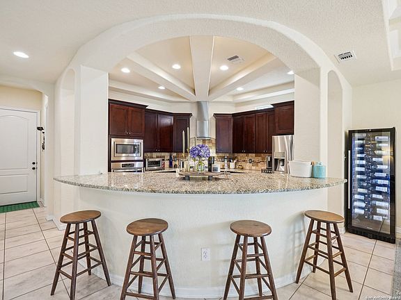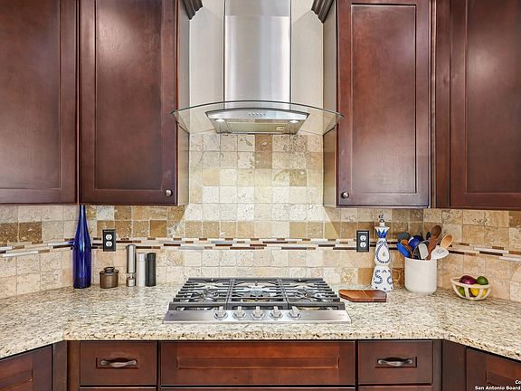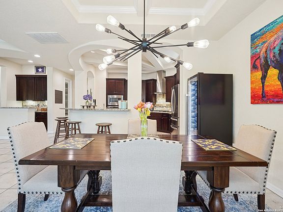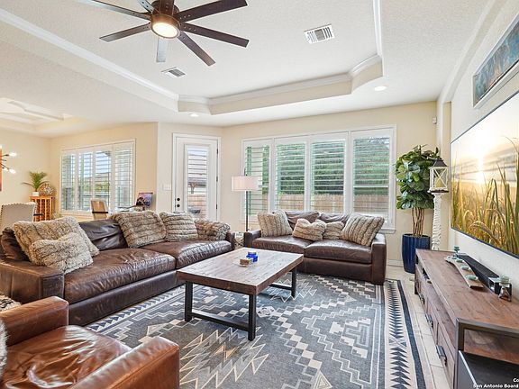 Stunning 3-Bedroom Home with Luxurious Upgrades Welcome to this beautifully maintained 3-bedroom, 2.5-bath home offering approximately 2,500 square feet of thoughtfully designed living space. Located in a quiet cul-de-sac in Guadalupe County with affordable taxes-this home offers both comfort and convenience with easy access to IH-35, Loop 1604, Randolph Air Force Base, and popular destinations like The Forum, New Braunfels, The Quarry, The Pearl, and La Cantera. Step inside to a grand two-story entry and experience the open-concept layout enhanced by soaring ceilings, large windows, and an abundance of natural light. The home features seven unique ceiling treatments, including elegant tray ceilings in the dining, living, bar, and primary suite. The gourmet kitchen features an expansive island beneath a stunning wagon wheel tray ceiling. Culinary enthusiasts will appreciate the granite countertops, travertine backsplash, walk-in oversized pantry, and stainless steel built-in appliances including a chimney hood and a 2024-installed gas range with propane tank. A dry bar adds convenience and charm. Additional interior highlights: Custom 2-inch wood blinds and wood shutters (with transferable lifetime warranty) Impressive primary suite on the main floor featuring a walk-in shower, soaker tub, dual comfort-height vanities, and a spacious primary closet. Separate laundry room and half-bath on the main floor for convenience. Flex/playroom upstairs plus a storage closet under the stairs 8-foot doors, hidden TV cables, some updated light fixtures, and in-floor outlets in the living room. Iron staircase spindles, Ecobee smart thermostats, and a security system. Two A/C units, including a dedicated unit for the primary suite; main unit replaced in June 2024 along with duct sanitation, blown in attic insulation, and an attic fan. Energy efficiency and maintenance are top priorities with solar panels (installed Nov 2021), water heater (March 2025), dishwasher (2024), in-wall pest control, and sprinkler system. The home is also plumbed for a water softener and features a carbon monoxide detector for added peace of mind. Exterior features include a stone and stucco facade, tongue and groove patio ceiling, stone mailbox with locked box, and a 3-car side-entry garage that enhances curb appeal and privacy. Enjoy peace of mind with a structural engineering foundation investigation conducted in July 2024. Don't miss this incredible opportunity to own a meticulously cared-for, energy-efficient home near top schools, shopping, dining, and entertainment-with Fredericksburg and Austin just over an hour away.