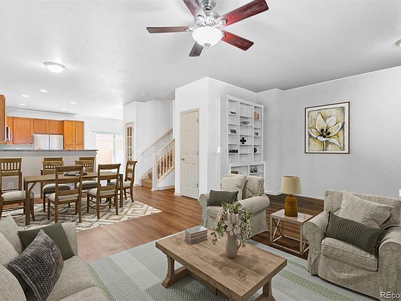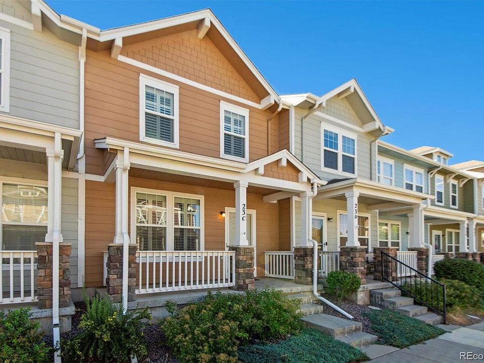 Welcome to your dream home! This stunning 3-bedroom, 3-bathroom townhome features a spacious open floor plan that invites you in through a covered front porch and charming entry into a light filled great room complete with a built-in bookcase. The great room is a perfect blend of style and comfort, showcasing beautiful flooring and custom shutters, open to the kitchen, entertaining has never been easier. The spacious kitchen is a culinary enthusiast's delight, offering ample countertop space, newer stainless steel appliances, a gas range, and new floors, while the adjoining dining area grants you direct access to a delightful patio through a sliding glass door—ideal for entertaining or enjoying quiet moments outdoors. On the main floor, you'll also find a convenient 1/2 bathroom -perfect for company. Venture upstairs to discover the expansive primary bedroom, which boasts a walk-in closet and an updated, private bathroom complete with dual sinks, a luxurious soaking tub and separate shower for ultimate relaxation. Upstairs laundry area with a washer and dryer included, makes chores a breeze, while two additional bedrooms share a stylish full-sized bathroom, each fitted with chic window shutters. This townhouse also offers a detached 2-car garage that is not only spacious but equipped with a built-in workbench, pegboard for optimal organization, and a full-sized refrigerator—perfect for all your DIY projects. The serene outdoor space featuring a gardening bed for your green thumb is the perfect space to unwind and relax at the end of a hectic day. Located in the vibrant Fronterra Village community with incredibly low HOA dues of just $225 per month, you'll enjoy access to scenic walking trails and parks. Plus, with the convenience of being close to DIA, travel is a breeze. Offering easy access to shopping, dining and highways. Don’t miss the opportunity to make this beautiful townhouse your new home! Ask us for more info regarding lender incentives!