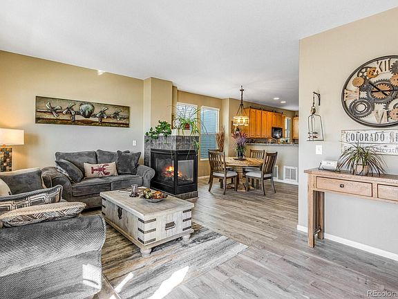 Gorgeous condo completely re-done from top to bottom. This end unit home is filled with light. Enjoy a morning cup of coffee and take in the amazing views of open space and occasional deer in the nature preserve. The sunrise is stunning from the from porch. Seller thought of everything to create a stunning model home. New neutral wood luxury plank vinyl flows throughout the open concept main level. Oversized living room shares a cozy triple sided fireplace with the ample dining room. Kitchen is spacious with loads of storage, newer appliances, kitchen island and pantry. Informal eating area can be used for another dining area or a great coffee bar space. The main floor also boasts a spacious half bath. Step outside on those warm summer evening to relax on the back deck with hanging outdoor lights. Small area for a garden or grass as desired leads to the 2 car gar garage with NEW garage door opener and ample overhead storage. Upstairs are two secondary bedrooms that share a guest bathroom. Laundry room is centrally located near the bedrooms. Primary bedroom completes the upstairs with stunning vaulted ceiling. Primary bath has a lovely tub for an evening soak, shower, dual sinks and it's own linen closet. Additional storage in the under-stair closet and the crawl space. Easy access to E470, I 76, Hwy 85 and very close to DIA. Close to schools, parks, restaurants and shopping! Don't miss your opportunity to own this gorgeous condo!