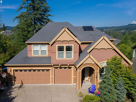 Enjoy stunning Mt. Hood & sunset views in this spacious & bright home in a desirable community. This 5 bedroom home features a bedroom w/ full bath on main, 3 car garage w/8' door, solar panels, private gate to community green space & walking trails behind home, fenced dog run & garden & Hunter Douglas darkening shades. Neighborhood features include multiple paved walking paths & community playground.