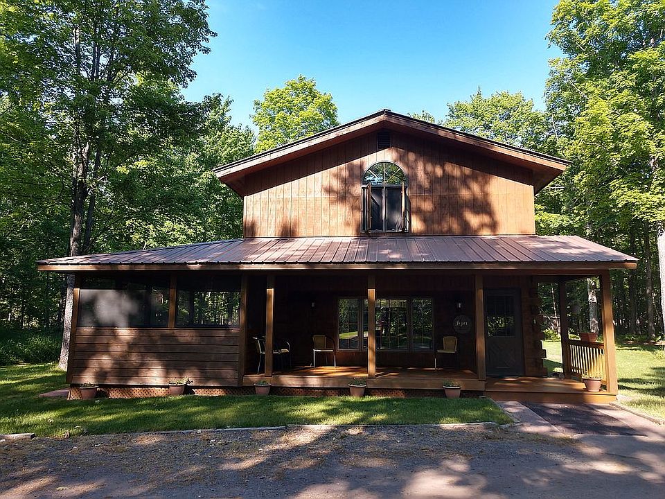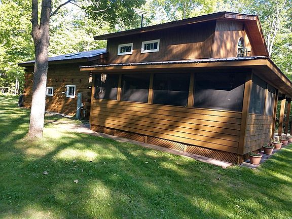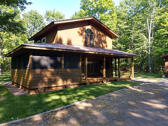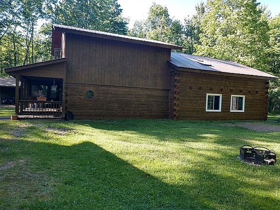 Charming log home with 2,952 square feet of living space, 4 bedrooms and 3 bathrooms on 14.9 acres on Bellaire Road in Baraga. Country living at its best, with private, wooded property, just 5 miles from the Village of Baraga. The 1200 foot long driveway, lined with massive pine trees, blackberry bushes, and apple trees, leads you back to the house and two garages - a two car garage measuring 24 x 44 ft. with a workshop area in the back section of the garage, and an additional garage which is 24 x 24, with an attached overhang used as a woodshed to supply the outdoor wood boiler located next to this garage. The house includes a wrap around porch on the front and north side, open on the front, and screened in on the north side with a hot tub in the screened in area. The screened porch can be entered either from the open porch or from the front family room through french doors. There is also a screen house in the back yard which is a great place to sit while barbecuing on the cement patio located outside the kitchen door at the back of the house. The main floor of the home has a family room with a built in bar; two utility rooms housing the furnace, hot water heater, well tank, storage, etc.; a large bathroom with shower (which also includes the washer and dryer behind closet doors); living/dining room, and updated kitchen. The upper floor has a large master suite with walk-in closet and 3/4 bath, three additional bedrooms, and a full bath with tub/shower. The house is heated by the wood boiler and/or a gas furnace which uses propane. This home includes many updates and was freshly stained on the outside in June 2021, new carpeting in October of 2020, new windows in 2017, and new expanded electrical panel in 2020. No agents, please.