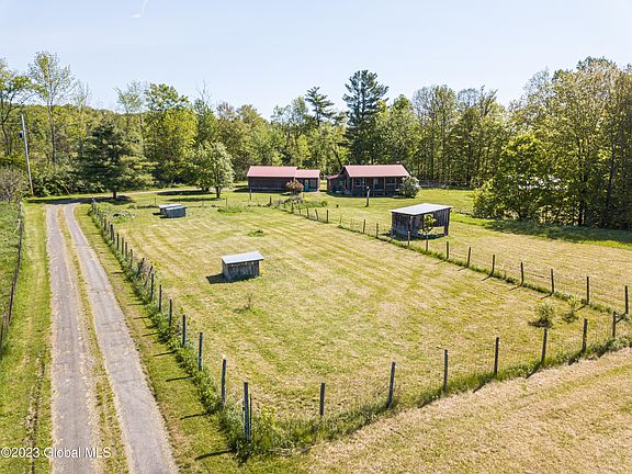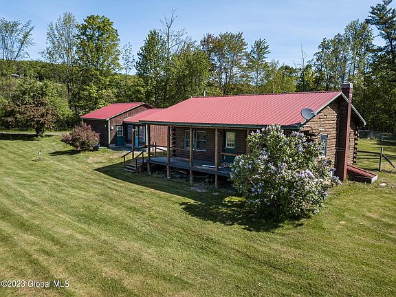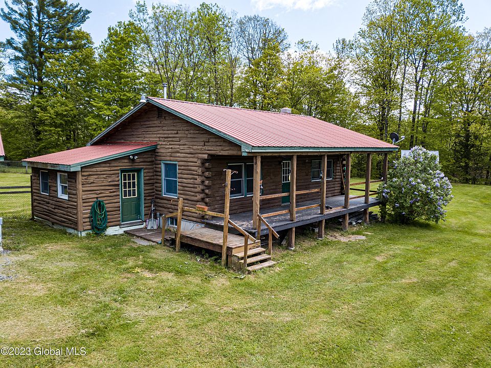 2 bedroom 1 full bath log home with a southerly facing front porch for your morning coffee or afternoon relaxation. Full basement with concrete poured foundation, hot water heat, detached garage, fenced dog yard, barn with stalls for your animals. pastures that are partially fenced. Lots of potential. Private location.
