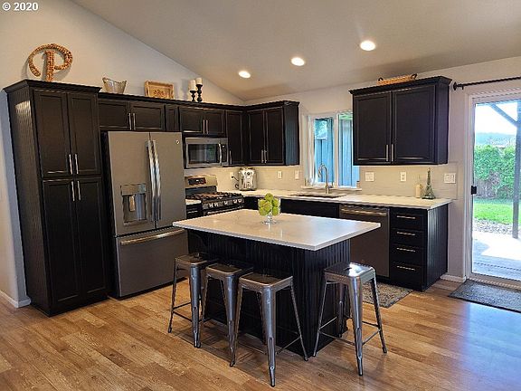 Modern updated beauty with Coast range sunset views.Open floor plan.Great for entertaining.NEW:Quartz counters(kitchen and both baths),flooring,new slate Appliances,faucets,hardware,light fixtures,tile,updated both baths,master bath with lighted LED mirrors,tile shower glass door-natural light,tile entry.Gas forced air,RV gated parking 29',storage shed,south face garden beds,Fully fenced,end of street privacy,safe low traffic close to parks,school and Wetlands.Painted epoxy GA high gloss floor.