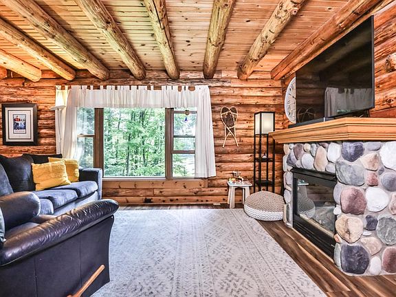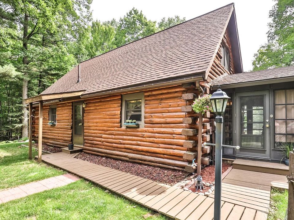 LITTLE MUSKIE LAKE: Full Log charmer for the essence of the "Up North" life! Cozy and "right sized" home or cottage is a delight, with log and knotty pine décor, stone fireplace (gas fired!), a country-inspired kitchen, beautiful wilderness lake views...well, the list is very long! Main level open concept living with owners bedroom, shower bath and laundry. Upstairs, two large guest rooms - skylights - another full bath, and a sunny staircase landing give options for family, friends, and your treasures. Really private setting on full rec lake on the edge of all area conveniences. The frontage is marshy, and not swimming style, but with some effort, you can get a canoe / kayak to the main lake. And the views of "your side" of the lake are fresh and beautiful. The package rounds off w a full unfinished basement, oversize almost-3 car garage, blacktop drive, excellent screen porch w Florida style windows, campfire circle...well, it's pretty perfect and at this price, better see it now!