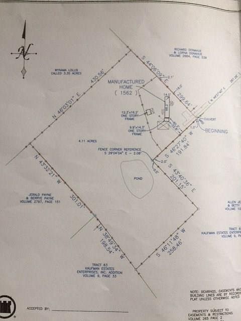 Handyman Special! Quiet, peaceful, secluded country living at very end of dead end road only 3.5 miles from downtown Kaufman! Enchanting pond w 2 old weeping willows, older 1984 mobile home, 24 x 24 free-standing carport, 2 storage buildings...10 x 14 and 12 x 16. Mobile home has 2 br's 2 baths,combo living, kitchen with 2-seat center island and walk in pantry w WD connections, covered front porch approx 13 x 10 and small covered back porch. One bedroom has dbl closets and great big bay window and master has walk-in closet w private bath. Property needs clean-up and remodel. Perfect for handyman! LR shares quaint pot belly stove w kitchen. No known restrictions--horses, cattle, goats OK! Won't go FHA.