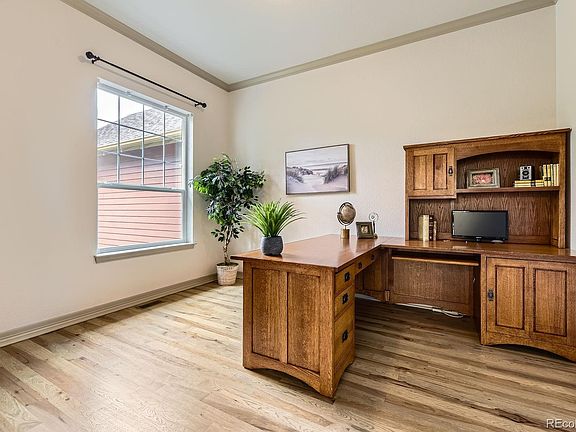 Welcome to this stunning 4-bedroom, 3-bathroom ranch-style retreat with breathtaking mountain and sunset views! Situated in the sought-after community of Escavera, this thoughtfully designed David Weekley home combines elegance and comfort with an open floor plan, 10 ft ceilings, as well as ideal finishes throughout. Step inside to find beautiful hickory hardwood floors flowing across the main level, complementing an expansive Great room filled with abundant natural light while showcasing a floor-to-ceiling stacked stone fireplace. The spacious kitchen is a chef’s dream, providing a quartz center island plus separate breakfast bar, gas cooktop, convection wall oven/microwave combo, ample cabinet space, pantry, and an inviting eat-in area—perfect for everyday living and entertaining. A formal dining room sits just off the kitchen, offering a refined space for special gatherings. At the front of the home, a bright office with open space views provides an ideal work-from-home set-up. The primary suite is a true retreat, boasting a spa-like 5-piece bathroom plus a generously sized walk-in closet. Two additional bedrooms along with a full bathroom complete the main floor. Downstairs, the finished walk-out basement offers incredible versatility featuring a large flex space for rec/media room, built-in entertainment center, and a stylish wet bar which allows seating for up to 5. An additional bedroom and full bathroom provide ideal accommodations for guests, as well as a bonus room for those favorite hobbies. Step outside to enjoy your backyard oasis which features an astroturf lawn and relaxing 6-man hot tub—perfect for enjoying the outdoors year-round. This "lock and leave" property includes HOA amenities of front lawn maintenance, sprinkler winterization/dewinterization, and snow removal, allowing you to travel worry-free. Don’t miss a chance to make this exceptional home ‘yours’!